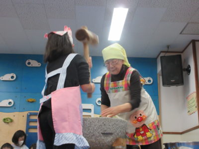 年長さんがもちつきに挑戦。