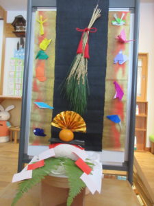 年長さんが作ったかがみもちと折り紙、稲を飾りました。